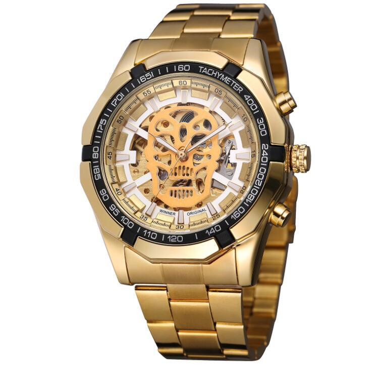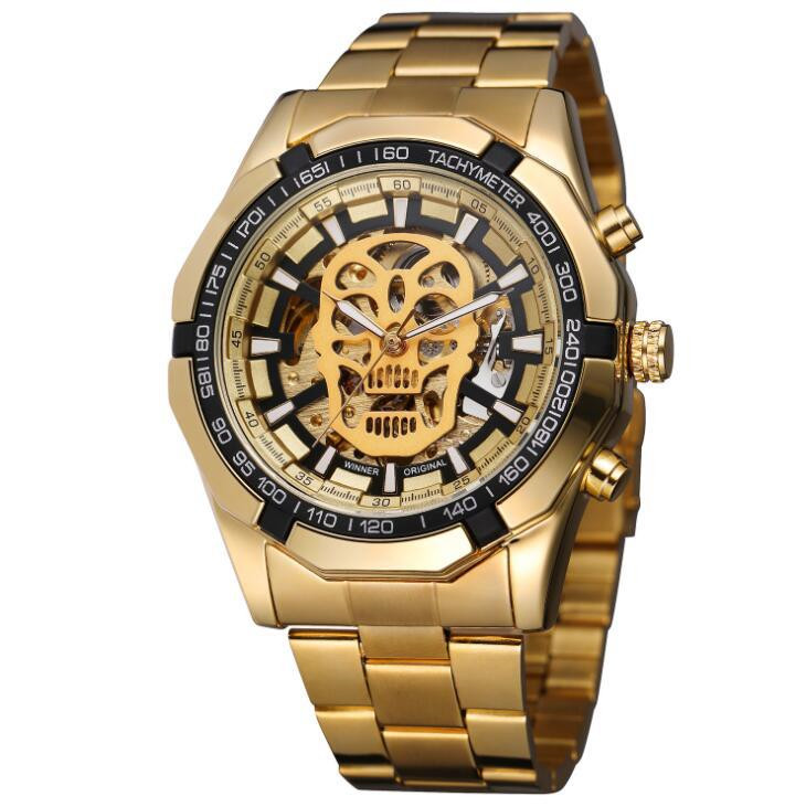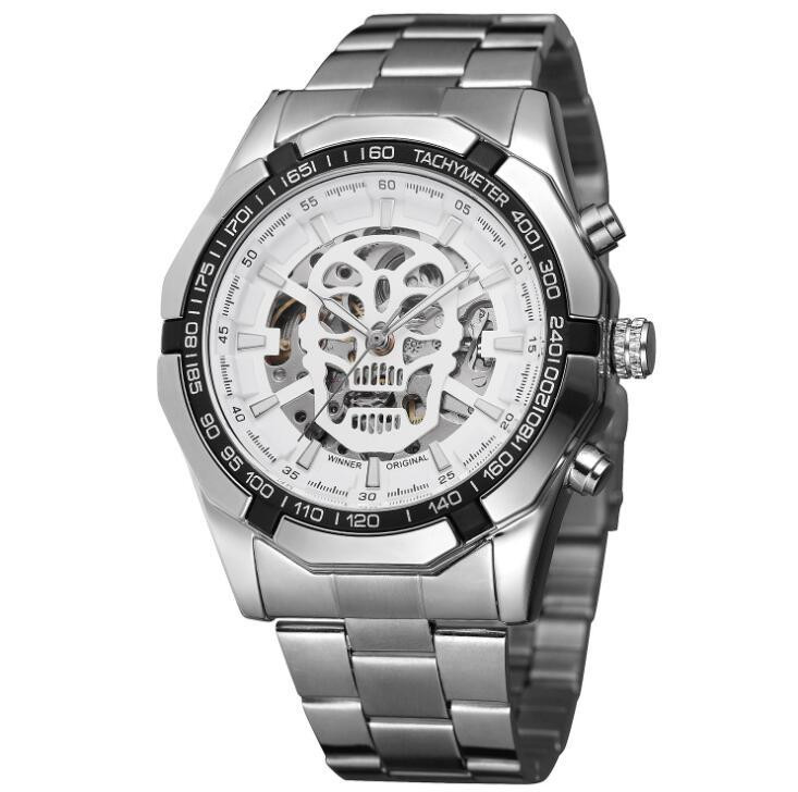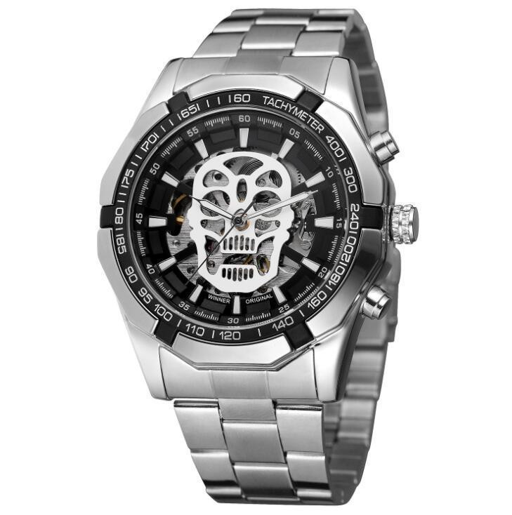 Introducing the ultimate statement piece for the modern gentleman - the Winner Mechanical Watch . This stylish and casual timepiece is designed to elevate your look while showcasing a unique flair with its luminous skull design . Crafted with precision, this watch features a mechanical movement that ensures reliability and longevity. The 46.5mm dial is elegantly balanced by a 15mm thickness , making it the perfect accessory for any occasion. With a flat top tapered crown and a single folding stainless steel buckle, this watch combines functionality with style. Whether you're heading out for a night on the town or enjoying a casual day out, the Winner Mechanical Watch is your go-to accessory. The mineral strengthened glass mirror adds durability, while the striking alloy strap guarantees comfort and style. Available in an array of colors to suit your personal taste, including: